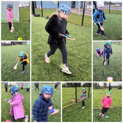 The children in Senior Infants working really hard on their hurling skills with coach Carolanna.